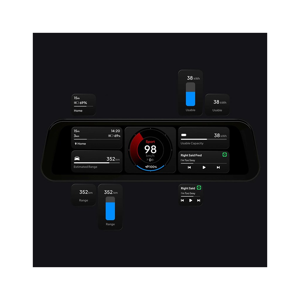9,6" dotykový QLED displej slúži ako plne prispôsobiteľný prístrojový panel pre Model 3/Y. Vďaka antireflexnej úprave a vyššiemu jasu je dobre čitateľný za všetkých podmienok a svojím elegantným spracovaním výborne ladí s minimalistickým interiérom vozidiel Tesla.